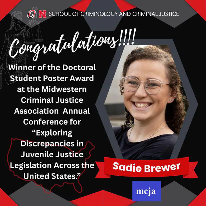 Doctoral Student Sadie Brewer won the Doctoral Student Poster Award at the Midwestern Criminal Justice Association (MCJA) conference. Her poster was titled, “Exploring discrepancies in juvenile justice legislation across the United States.”